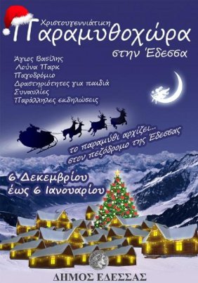Ο Δήμος Έδεσσας σε συνεργασία με τοπικούς φορείς διοργανώνει τη λειτουργία χριστουγεννιάτικου χωριού στο κέντρο της πόλης. Το Χριστουγεννιάτικο Χωριό θα έχει τίτλο «Χριστουγεννιάτικη Παραμυθοχώρα» και οι δραστηριότητές του θα περιλαμβάνουν σπίτι Αη Βασίλη, λούνα πάρκ, καθημερινές δραστηριότητες για παιδιά, συναυλίες και εκδηλώσεις.