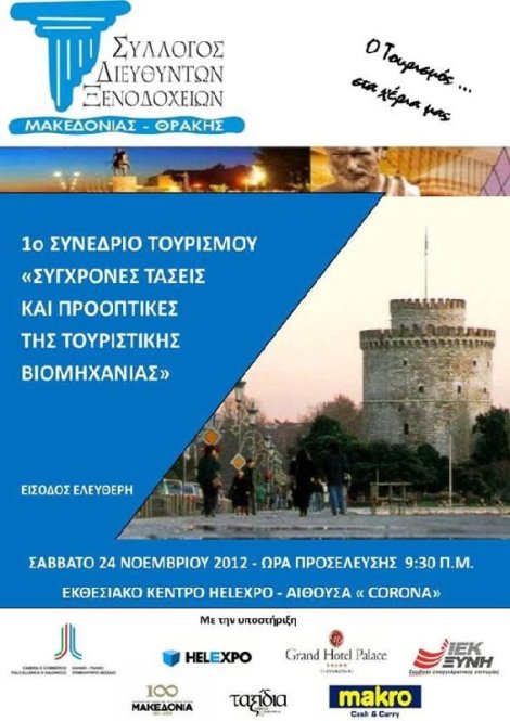 Στο πλαίσιο της διεθνούς τουριστικής έκθεσης Filoxenia θα πραγματοποιηθεί το Σάββατο 24 Νοεμβρίου 2012 στο εκθεσιακό κέντρο Helexpo αίθουσα Corona το 1ο Ετήσιο Συνέδριο Τουρισμού με θέμα «Σύγχρονες τάσεις και προοπτικές της τουριστικής βιομηχανίας». Μεταξύ των επιβεβαιωμένων ομιλητών είναι: ο πρόεδρος του ΣΕΤΕ Ανδρέας Ανδρεάδης, ο πρόεδρος του αντίστοιχου ΣΕΤΕ Ιταλίας ο γενικός γραμματέας Τουρισμού Αναστάσιος Λιάσκος, η αντιπρόεδρος του ΗΑΤΤΑ Δέσποινα Αμαραντίδου, ο γενικός διευιθντής Οργανισμού Τουριστικής Προβολής Θεσσαλονίκης Νικόλας Σαπουντζής, ο γενικός διευθυντής του Hyatt Regency Thessaloniki Ματαθίος Γεωργίου, ο ιδιοκτήτης του Thraki Palace Hotel & Conference Center Απόστολος Πολακίδης, ο καθηγητής Τουριστικού Μάρκετινγ Α.Τ.Ε.Ι. Θεσσαλονίκης Ευάγγελος Χρήστου κ.ά. Η είσοδος είναι ελεύθερη!!!