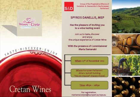 Προσκεκλημένοι του Ευρωβουλευτή Σπύρου Δανέλλη, τα μέλη του Wines of Crete θα παρουσιάσουν το ερχόμενο τριήμερο 26-28 Νοεμβρίου τα κρασιά του νησιού σε μια σειρά από προγραμματισμένες εκδηλώσεις.