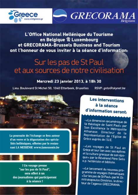 Την ημερίδα που φέρει, όπως μας πληροφορεί το newsville.be, τον τίτλο «Στα βήματα του Αποστόλου Παύλου και τις πηγές του πολιτισμού μας», θα τιμήσει με την παρουσία του και θα μιλήσει ο Εξοχότατος Μητροπολίτης Αθανάσιος, Διευθυντής της Αντιπροσωπίας της Εκκλησίας της Ελλάδος στην Ε.Ε, καθώς και ο Αιδεσιμότατος Selis.