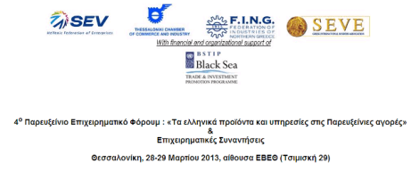 Στο πλαίσιο της στρατηγικής για την ενίσχυση της ελληνικής επιχειρηματικής εξωστρέφειας ο Σύνδεσμος Ελληνικών Επιχειρήσεων (ΣΕΒ), το Εμπορικό και Βιομηχανικό Επιμελητήριο Θεσσαλονίκης (ΕΒΕΘ), ο Σύνδεσμος Βιομηχανιών Βορείου Ελλάδος (ΣΒΒΕ) και ο Σύνδεσμος Εξαγωγέων Βορείου Ελλάδος (ΣΕΒΕ), με την υποστήριξη του Αναπτυξιακού Προγράμματος των Ηνωμένων Εθνών (UNDP), διοργανώνουν το 4ο Παρευξείνιο Επιχειρηματικό Φόρουμ στη Θεσσαλονίκη, την Πέμπτη 28 Μαρτίου και την Παρασκευή 29 Μαρτίου 2013.
