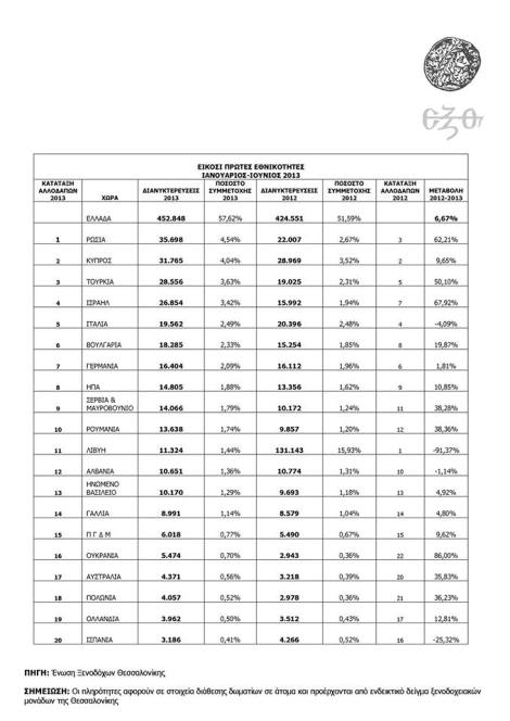 Επιπλέον, σε απόλυτους αριθμούς και στο γενικό σύνολο, από τον Ιανουάριο έως και τον Ιούνιο του 2013 σημειώθηκαν στα ξενοδοχεία της Θεσσαλονίκης 812.040 διανυκτερεύσεις έναντι 860.533 πέρυσι, δηλαδή υπήρξε πτώση κατά -5,20 %.