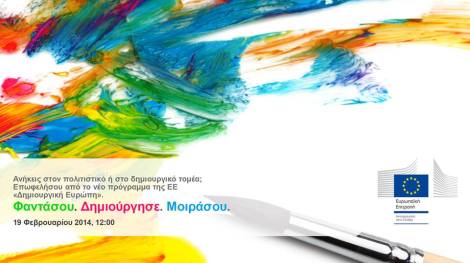Η Αντιπροσωπεία της Ευρωπαϊκής Επιτροπής στην Ελλάδα παρουσιάζει το webinar #CreativeEU: «Επωφελήσου από το νέο πρόγραμμα της ΕΕ ‘Δημιουργική Ευρώπη’. Φαντάσου. Δημιούργησε. Μοιράσου» ,δίνοντας σε καλλιτέχνες τα κλειδιά για να βρουν τρόπους χρηματοδότησης της τέχνης ή/και των δραστηριοτήτων τους! Δηλώστε συμμετοχή σήμερα στο events-COMM-repGR@eurodyn.com !