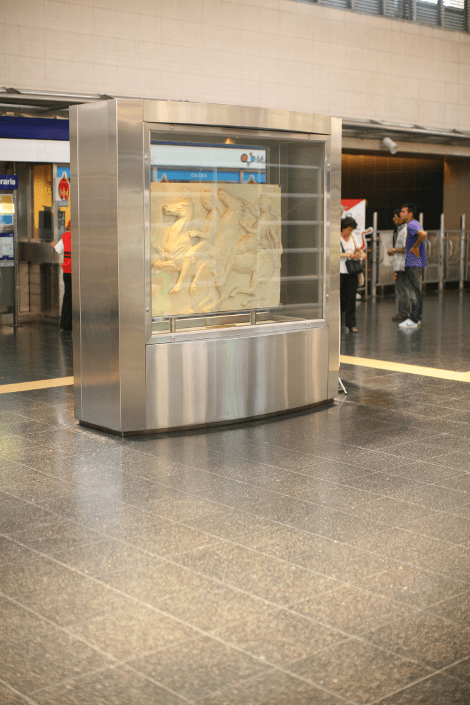 Στον σταθμό, από τον οποίο υπολογίζεται ότι περνούν καθημερινά 22.000 επιβάτες, παρουσιάζονται 23 προσκετικά επεξεργασμένα αντίγραφ από γύψο, χαλκό και ασήμι, τα οποία απεικονίζουν εμβληματικά για τον δυτικό πολιτισμό θέματα.