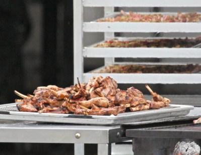 The grill was filled with mesquite charcoal made by the Lazzari company, and the lamb chops were cooked rare over the white-hot and smoking coals. A rolling rack contained many sheets of lamb chops.