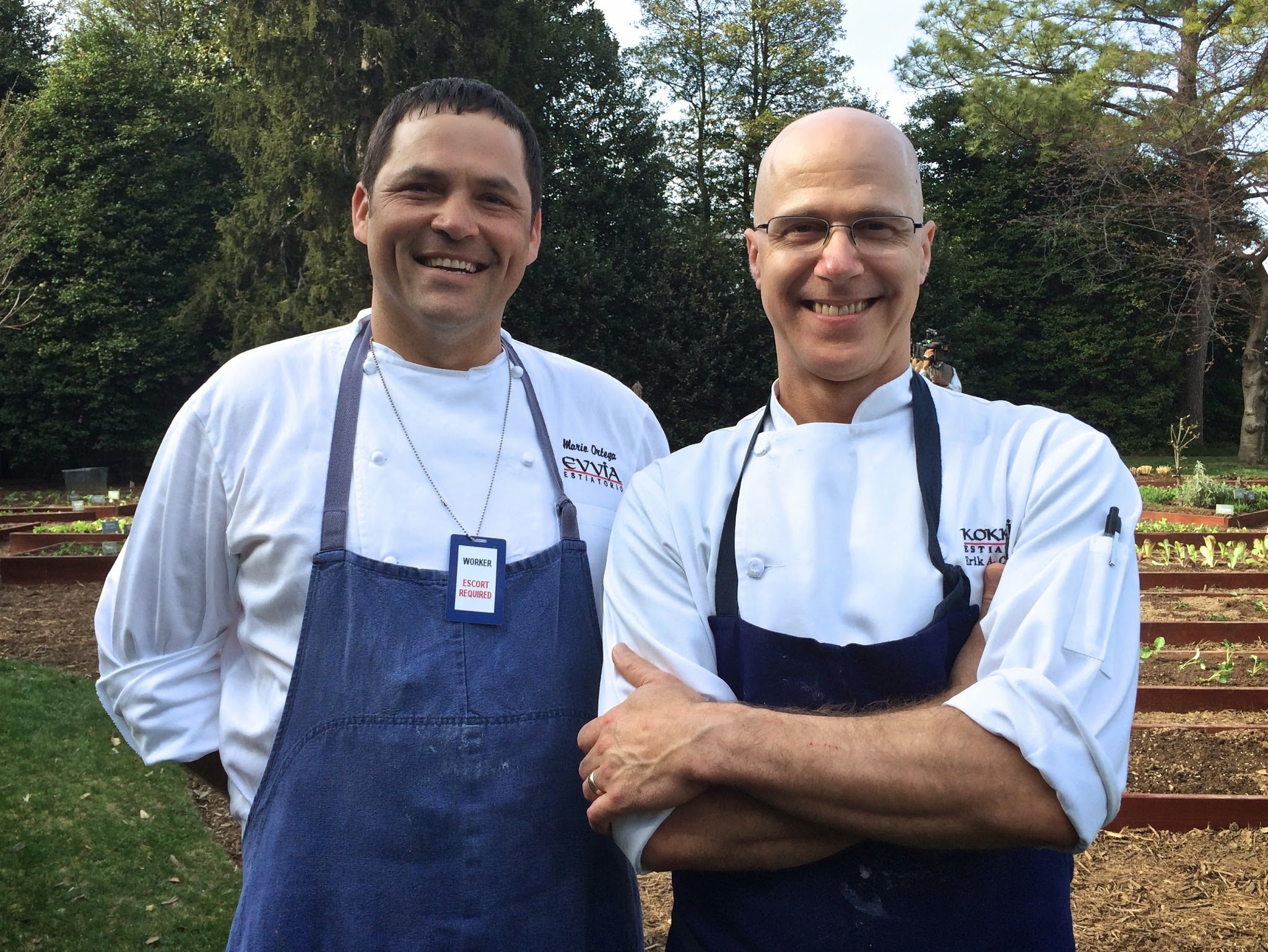 Erik A. Cosselmon, Executive chef at San Francisco’s Kokkari Estiatorio and Mario Ortego, Executive Chef at Palo Alto’s Evvia have been at the White House since Wednesday, working with White House Executive Chef Cris Comerford and Executive Pastry Chef Bill Yosses and their teams. The two restaurants are owned by the same culinary group, and have gotten high marks from critics.