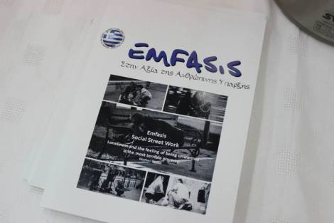 Emfasis Foundation: Μη-κερδοσκοπικός οργανισμός, το πνευματικό δημιούργημα μιας ομάδας Ελλήνων πολιτών που ζουν στο εξωτερικό, οι οποίοι σε συνεργασία με κοινωνικούς εμπειρογνώμονες και εθελοντές που εδρεύουν στην Αθήνα, και χρησιμοποιώντας τις αρχές της Κοινωνικής Εργασίας στο Δρόμο (Social Street Work), στοχεύουν στην ολική αντιμετώπιση των αναγκών κοινωνικά ευάλωτων ομάδων (άστεγοι, άνεργοι, οικογένειες κάτω από την όριο της φτώχειας, παιδιά του δρόμου, περιθωριοποιημένοι ηλικιωμένοι, εξαρτημένοι απαγορευμένων ουσιών).