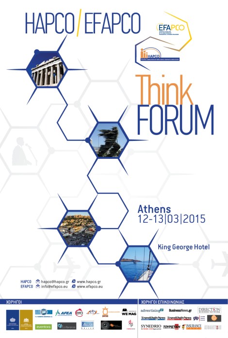 Σημείο συνάντησης όλων των επαγγελματιών από το χώρο των συνεδρίων και εκδηλώσεων σε ευρωπαϊκό επίπεδο θα αποτελέσει την Πέμπτη 12 και την Παρασκευή 13 Μαρτίου 2015 η Αθήνα. Αφορμή η διοργάνωση από το Σύνδεσμο Ελλήνων Επαγγελματιών Οργανωτών Συνεδρίων – HAPCO με θέμα «HAPCO / EFAPCO Think FORUM», στο πλαίσιο της οποίας θα πραγματοποιηθεί και η επετειακή Γενική Συνέλευση μελών της EFAPCO (European Federation of the Associations of Professional Congress Organisers), που επιστρέφει και πάλι στην ελληνική πρωτεύουσα έπειτα από 10 χρόνια.