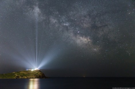 Αν και αυτό μπορεί να δείχνει σαν φάρος, οι ακτίνες του φωτός στον ορίζοντα στην πραγματικότητα προέρχονται από το Ναό του Ποσειδώνα στο Σούνιο. Μερικά φώτα του ναού αντανακλώνται στο Αιγαίο Πέλαγος σε πρώτο πλάνο. Η φωτογραφία τραβήχτηκε πριν από τρεις εβδομάδες.