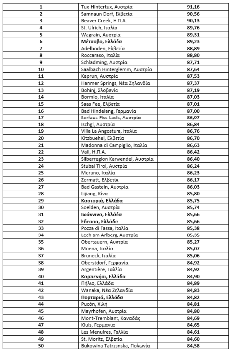 Την πλειοψηφία των θέσεων, όπως ήταν αναμενόμενο, έχουν καταλάβει αυστριακοί και ελβετικοί προορισμοί. Αξιοσημείωτη, όμως, είναι και η ύπαρξη αρκετών ελληνικών προορισμών μεταξύ των 50 δημοφιλέστερων χειμερινών, οι οποίο είναι ιδανικοί για σκι. Η κατάταξη περιέχει προορισμούς που είτε διαθέτουν χιονοδρομικό κέντρο, είτε βρίσκονται σε απόσταση αναπνοής από ένα.