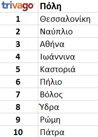 Τόσο πέρυσι, όσο και φέτος οι προτιμήσεις των Ελλήνων φαίνονται να είναι διασκορπισμένες σε όλο το εύρος της χώρας και σε μικρό ποσοστό εκτός αυτής. Οι τρεις πόλεις που προτιμώνται περισσότερο παραμένουν ίδιες με τις περσινές, ανταλλάσσοντας μόνο θέσεις μεταξύ τους. Η μεγαλύτερη προτίμηση φέτος παρουσιάζεται για την Θεσσαλονίκη, που την αντίστοιχη περίοδο πέρυσι ήταν μια θέση πιο χαμηλά. Στη δεύτερη θέση εμφανίζεται το Ναύπλιο, μια θέση χαμηλότερα από την αντίστοιχη περσινή. Η πρώτη πεντάδα ολοκληρώνεται με την Αθήνα, τα Ιωάννινα και την Καστοριά. Στην έκτη θέση φέτος κάνει την παρουσία του το Πήλιο, ακολουθούμενο από τον Βόλο και την Ύδρα. Όγδοη στις προτιμήσεις είναι η Ρώμη, δίνοντας έναν ελαφρά διεθνή αέρα στις προτιμήσεις των Ελλήνων, ενώ η τελευταία θέση ανήκει στην Πάτρα.