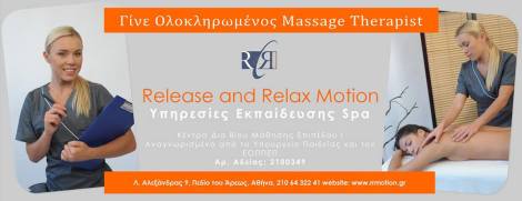 Η αναγνωρισμένη από το Υπουργείο Παιδείας και τον ΕΟΠΠΕΠ σχολή μασάζ Release and Relax Motion στοχεύει στη δημιουργία εξειδικευμένων επαγγελματιών και στη συνεχή ανέλιξή τους στο διαρκώς αναπτυσσόμενο τομέα της ομορφιάς και της ευεξίας. Οι ενδιαφερόμενοι έχουν τη δυνατότητα να επιλέξουν μεταξύ των ειδικοτήτων του Spa Therapist, Massage Therapist, Beauty Therapist ή άλλα μεμονωμένα εκπαιδευτικά προγράμματα της αρεσκείας τους.