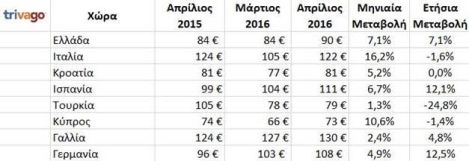Η μέση τιμή για την Ελλάδα για τον Απρίλιο διαμορφώνεται στα 90 ευρώ, εμφανίζοντας αύξηση κατά 7,1 τοις εκατό, τόσο σε ετήσια όσο και σε μηνιαία βάση. Η Κροατία, από την άλλη, είναι μεταξύ των χωρών που διατήρησαν απόλυτα σταθερές τις τιμές τους σε σχέση με το 2015, αντίθετα με την Ισπανία, τη Γαλλία και τη Γερμανία που τις αύξησαν κατά μέσο όρο. Μειωμένες τιμές φαίνεται να έχει η Ιταλία, στα 122 ευρώ, χαμηλότερες από πέρυσι κατά 1,6 τοις εκατό. Αντίστοιχα, μειωτική πορεία στις τιμές σε σχέση με την περασμένη χρονιά είχαν η Τουρκία και η Κύπρος. Η Τουρκία, μάλιστα, με μέση τιμή στα 79 ευρώ, φαίνεται να μείωσε σημαντικά τις τιμές σε σχέση με τον Απρίλιο του 2015, κατά 24,8 τοις εκατό, ενώ η Κύπρος μόνο κατά 1,4, φτάνοντας κατά μέσο όρο στα 73 ευρώ.
