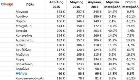 Πιο αναλυτικά, όσον αφορά στο πώς μεταβλήθηκαν οι ξενοδοχειακές τιμές συγκεκριμένων πόλεων, παρατηρούνται ενδιαφέρουσες αλλαγές. Σημαντικές αυξήσεις εμφανίζονται σε ετήσια βάση στη Στοκχόλμη, τη Μαδρίτη και τη Βαρκελώνη, οι οποίες είναι ακριβότερες κατά περισσότερο από 10 τοις εκατό η κάθε μία. Οικονομικότερες ωστόσο, κατά 10 περίπου τοις εκατό φαίνονται να είναι το Λονδίνο, το Παρίσι και η Ρώμη. Η σημαντικότερη μεταβολή παρουσιάζεται στην Κωνσταντινούπολη, η οποία φαίνεται να έχει μειώσει τις τιμές της κατά περισσότερο από 30 τοις εκατό, σε σύγκριση με τον Απρίλιο του 2015, με μέση τιμή στα 81 ευρώ. Η Αθήνα, από την άλλη, φαίνεται να έχει αυξήσει λίγο τις τιμές της, στα 95 ευρώ, από τα 90 που ήταν πέρυσι τον Απρίλιο.
