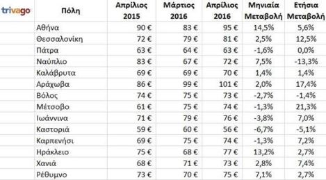 Τόσο αυξήσεις, όσο και μειώσεις φαίνεται να χαρακτηρίζουν την πορεία με την οποία μεταβλήθηκαν οι τιμές των ξενοδοχείων σε ελληνικές πόλεις σε ετήσια βάση. Σημαντική μείωση παρουσιάζεται στο Ναύπλιο, του οποίου τα ξενοδοχεία είναι κατά 13,3 πιο οικονομικά προσιτά. Οικονομικότερα, επίσης, παρουσιάζονται και τα ξενοδοχεία τόσο στην Καστοριά, όσο και στον Βόλο. Ακριβότερα, ωστόσο, συγκριτικά με πέρυσι είναι τα ξενοδοχεία της Θεσσαλονίκης, κατά 12, 5 τοις εκατό, με μέση τιμή στα 81 ευρώ, της Αράχωβας, με τιμή που διαμορφώνεται στα 101 ευρώ και του Μετσόβου, στα 74 ευρώ, από τα 61 που ήταν πέρυσι τον Απρίλιο.