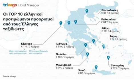 Περισσότεροι Έλληνες ταξιδιώτες προτιμούν να περάσουν τις λαμπρές και γιορτινές μέρες του φετινού Πάσχα επισκεπτόμενοι ελληνικό προορισμό, σε αντίθεση με την περυσινή χρονιά. Συγκεκριμένα και όπως αποσαφηνίζεται σε τελευταία έρευνα της trivago, τέσσερις ελληνικοί προορισμοί βρίσκονται στις 10 πρώτες θέσεις της προτίμησής τους, ενώ στο περσινό top 10 των δημοφιλών περιοχών για τους Έλληνες είχαν παρουσία μόνο δύο όπως διαφαίνεται ξεκάθαρα και στον πίνακα που ακολουθεί.