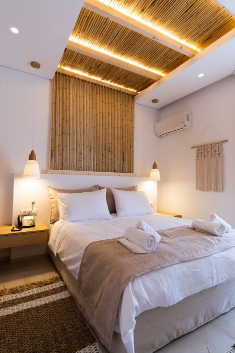 Τα παλ χρώματα του μπεζ επικρατούν στην επίπλωση σε συνδυασμό με το λευκό δημιουργώντας μια ανάλαφρη και καλοκαιρινή χαλαρωτική ατμόσφαιρα. Οι Deluxe Suites του ξενοδοχείου διαθέτουν άνετο queen size κρεβάτι με στρώματα Coco-Mat, με μενού μαξιλαριών, και θέα στην παραλία. Κάθε γωνιά του ξενοδοχείου είναι απόλυτα εργονομική διαθέτοντας όμως όλα τα απαραίτητα αξεσουάρ για μια άνετη διαμονή.