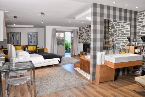 Στο μεγαλύτερο και πιο ογκώδες αρχοντικό, το οποίο βρίσκεται λίγο πιο ψηλά από την μέση του ξενοδοχείου, βρίσκεται ο χώρος υποδοχής , πάντα στην φιλοσοφία ενός «σπιτιού», χώρου οικείου & ζεστού, απέχοντας κατά πολύ από την κλασσική έννοια της reception των ξενοδοχείων όπως τα έχετε συνηθίσει. Συνεχίζουμε σε άλλα 2 επίπεδα ακόμα και μετά είναι το δάσος.