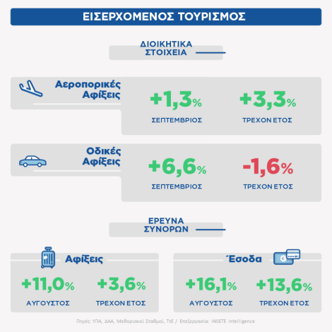 Η εισερχόμενη ταξιδιωτική κίνηση τον Αύγουστο του 2019 διαμορφώθηκε στις 6.762 χιλ. ταξιδιώτες, έναντι 6.093 χιλ. ταξιδιωτών τον αντίστοιχο μήνα του 2018, (+11,0%/+669 χιλ.). Την περίοδο Ιανουαρίου-Αυγούστου, η εισερχόμενη ταξιδιωτική κίνηση αυξήθηκε κατά +3,6% / + 754 χιλ. και διαμορφώθηκε στις 21.842 χιλ.