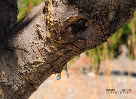 Την περίοδο του Αυγούστου επισκεπτόμασταν μαζί με τον πατέρα μου τα χωράφια όπου παρακολουθούσαμε με τα αδέλφια μου, τη μοναδική εμπειρία του κεντήματος του σχίνου από τον οποίο παράγεται η μαστίχα. Το δάκρυ θα πέσει πάνω στο ειδικό ασπρόχωμα το οποίο τοποθετείται γύρω από τον κορμό του σχίνου, προκειμένου όταν το δάκρυ πήξει να είναι όσο το δυνατόν πιο καθαρό από άλλες προσμίξεις.