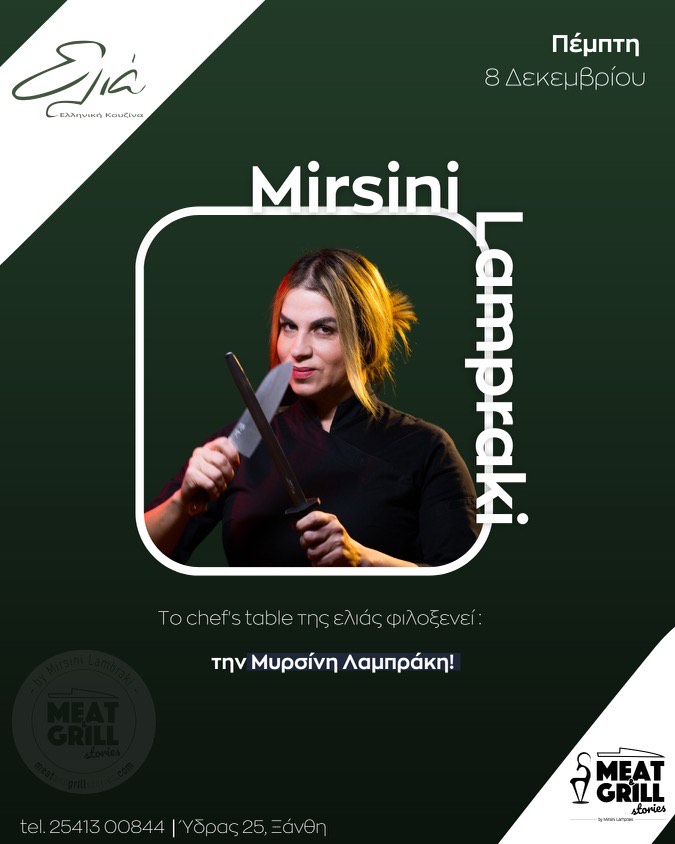 Αποδεχομένη την πρόταση- πρόσκληση του κ. Απόστολου και του κ. Αλέξανδρου Γκαλέντζου- ιδιοκτητών του εστιατορίου Ελιά το οποίο εδρεύει και λειτουργεί στη Ξάνθη εδώ και περίπου 3 χρόνια- η αεικίνητη, αυθόρμητη και πολυπράγμων chef θα δελεάσει ακόμα και τους πιο απαιτητούς γευσιγνώστες της Θράκης, της Βόρειας Ελλάδας, μαγειρεύοντας με ασίγαστο μεράκι και αξιοθαύμαστη αγάπη στο χώρο του Live Cooking που έχει δημιουργηθεί στο Ελιά.